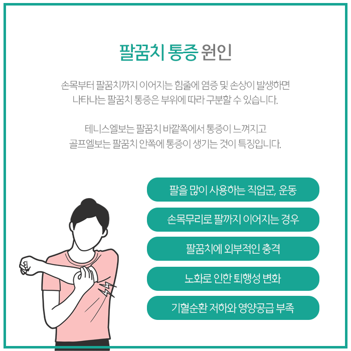 팔꿈치는 어깨와 손목을 연결하는 부위로, 팔꿈치 주변에 있는 근육이나 힘줄 등은 팔꿈치를 움직이는 것뿐만 아니라 어깨나 손목을 움직이는 데에도 관여를 합니다. 특히, 무거운 물건을 많이 들거나 키보드 작업 등을 할 때 팔꿈치를 많이 쓰게 되는데, 이러한 동작이 반복되면 팔꿈치 바깥쪽이나 안쪽에 통증이 나타날 수 있습니다.