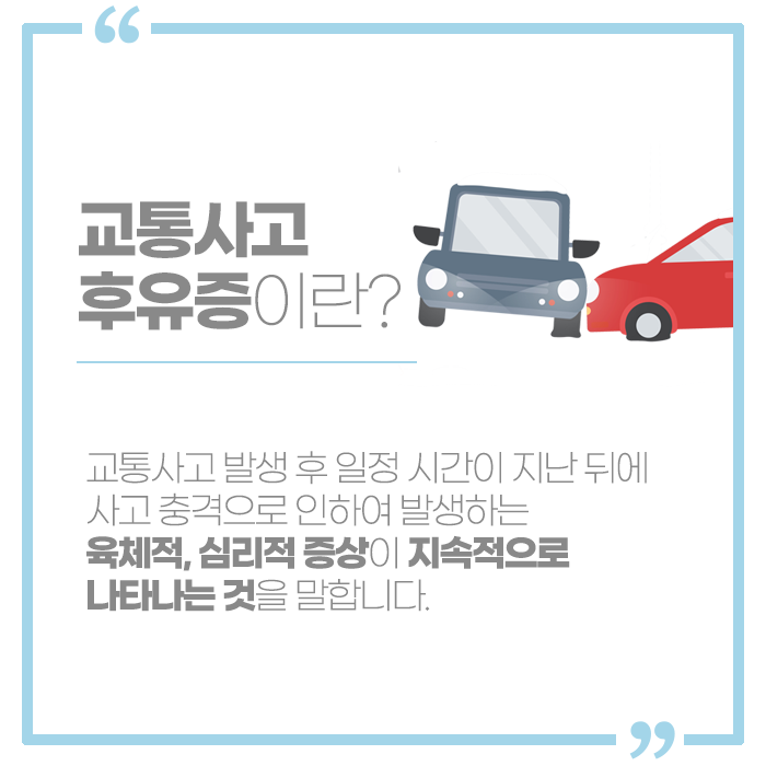 지금 당장은 괜찮은 것 같아도 사고 후에는 최소 일주일까지 컨디션과 몸 상태를 관찰할 필요가 있습니다. 불편함 혹은 이상 증상이 유발되기 전에 신속하게 진단을 받고 치료해야 합니다. 후유증은 보통 2~7일 정도 후에 발생하는 경우가 많으나 최대로는 수개월의 잠복기가 이어지기도 하므로 주의가 필요합니다.