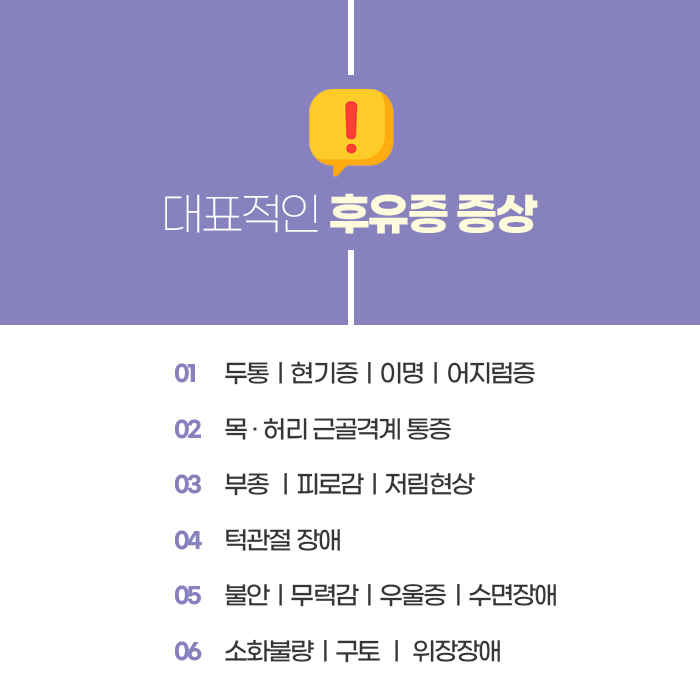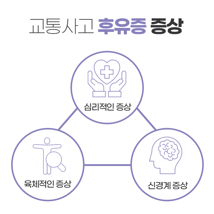 또한 육체적인 불편함을 넘어서 우울감, 불안함, 초조함, 외상 후 스트레스 장애 등이 발생하기도 합니다. 또한 더부룩함, 식욕부진, 메스꺼움, 구토, 불면증, 피로감, 부종 등 다양한 증상들도 사고로부터 유발된 후유증일 수 있습니다. 증상들은 곧바로 발생하기도 하지만 며칠이나 몇주 후에 점점 발생하므로 지속적으로 관찰하고 관리하도록 해야합니다.