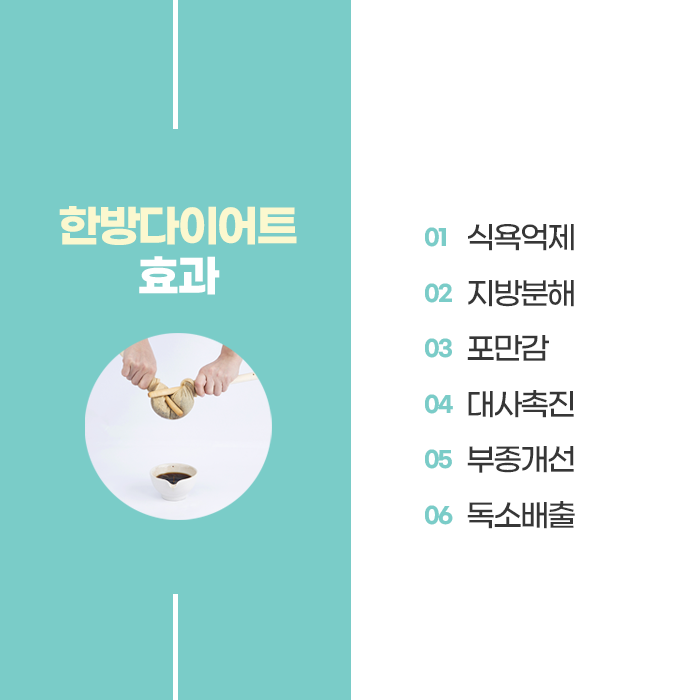 과체중과 비만을 개선해주는 고성동한방다이어트 는 적당하게 칼로리를 소모하게 해주고 신진대사를 활성화합니다. 또한 체내에 무리가 되지 않도록 식욕, 식사량을 조절하여 줍니다. 탄수화물이 지방으로 합성되는 것을 막아주고 체지방이 쌓이지 않게 예방하여 주어 지방 합성을 억제시켜 줍니다.