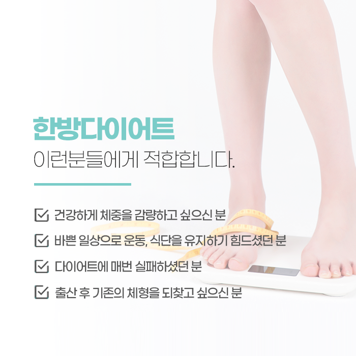 출산 후에 체중 감량이 잘 되지 않고 사이즈 감소가 필요하신 분들에게도 고성동한방다이어트 도움을 드리고 있습니다. 체질에 맞추어 처방하는 한약으로 체중을 감량해주고 변화된 체질을 긍정적으로 개선하여 줍니다. 또한 많은 산모들의 고민거리인 붓기를 제거하는데 도와줍니다. 기혈의 순환을 개선해주고 혈액 및 혈류를 정화해주어 부종을 개선하고 체중을 효과적으로 관리하여 줍니다.