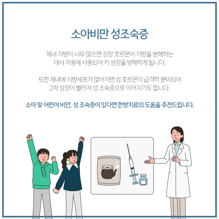 소아비만은 성인비만으로 이어질 확률이 높고 당뇨병, 고지혈증 등 각종 합병증을 유발할 수 있어 주의가 필요합니다. 그리고 비만인 아이의 경우 성조숙증으로 인해 키 성장이 방해받을 수 있어 보호자분의 적극적인 관리가 중요합니다.
