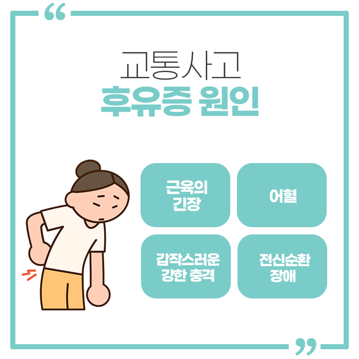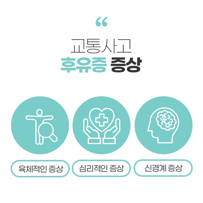 교통사고가 나면 가장 주의해야 할 것이 후유증입니다. 사고로부터 4주 동안의 집중적인 치료 과정이 가장 중요합니다. 그러나 단순한 접촉사고 정도일 경우 사고 당일~ 하루이틀까지 건강 상태가 괜찮다고 느껴질 수 있습니다. 그러나 일상 속에서 점점 몸을 사용할수록 뒤늦게 통증을 호소하게 되고, 서서히 증상이 유발됩니다.