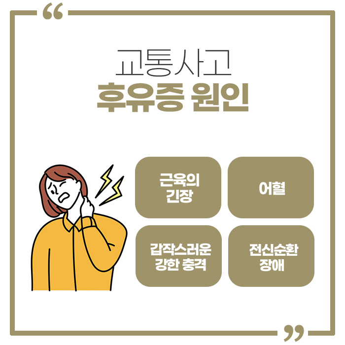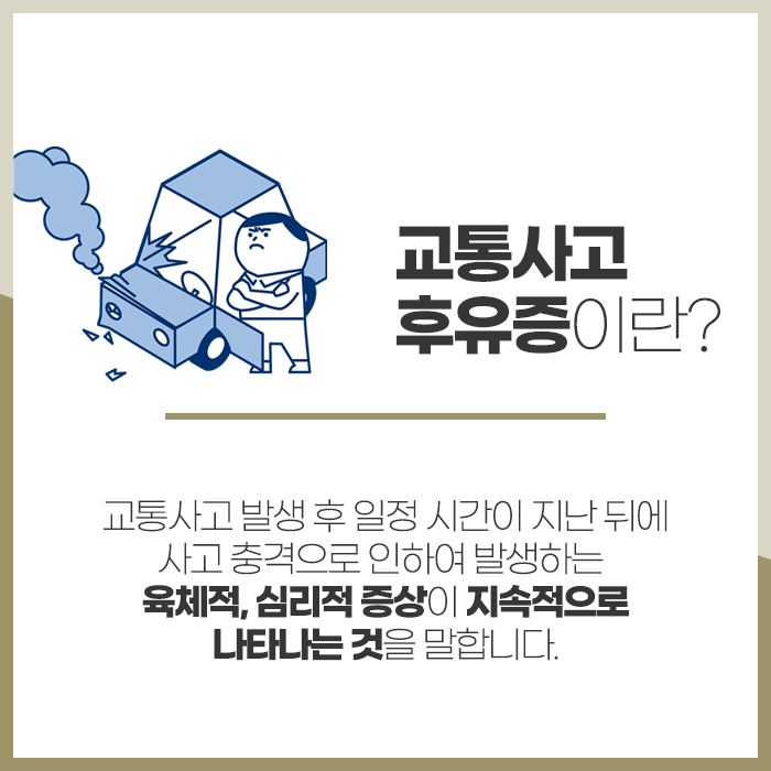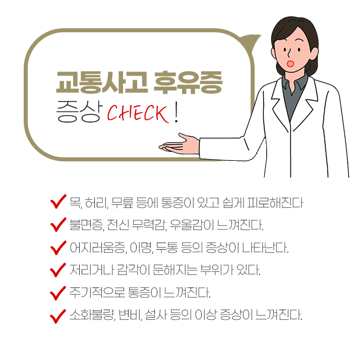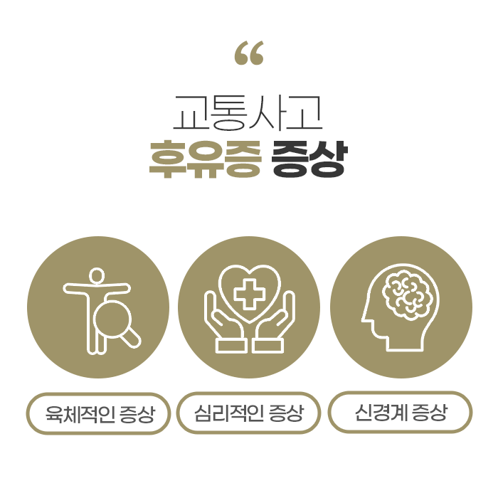 신체적인 증상 뿐만 아니아 외상 후 스트레스, 우울감, 불안감, 초조함 등의 증상들도 발생합니다. 또한 수족냉증, 부종, 불면증, 메스꺼움, 더불구함, 구토 등 다양한 ㅈ으상들도 사고로부터 발생할 수 있는 후유증일 수 있습니다. 증상은 곧바로 나타나는 경우도 있으나 며칠 혹은 몇주 후에 서서히 발생할 수 있기에 건강 상태를 면밀하게 살펴야 합니다.