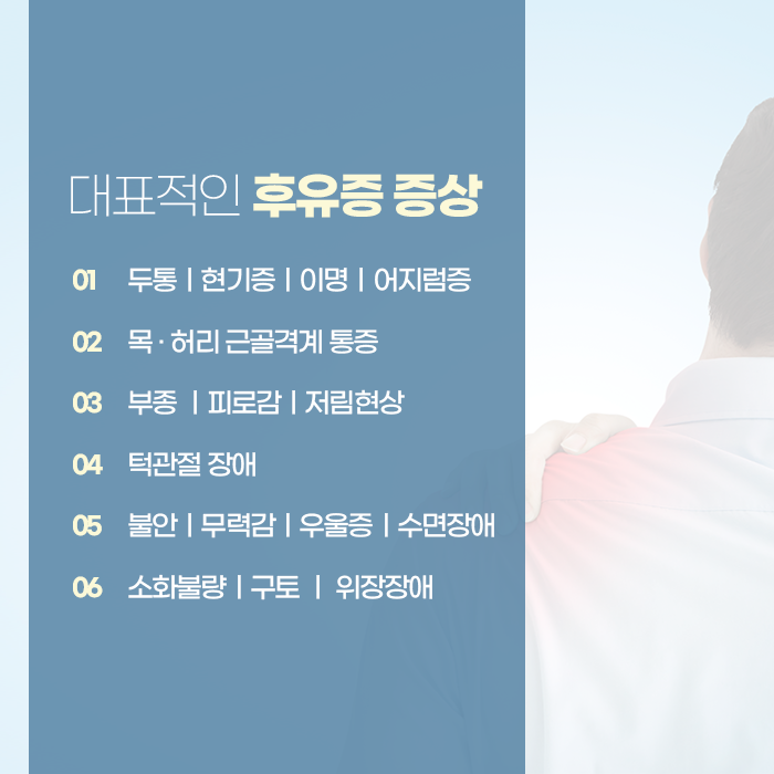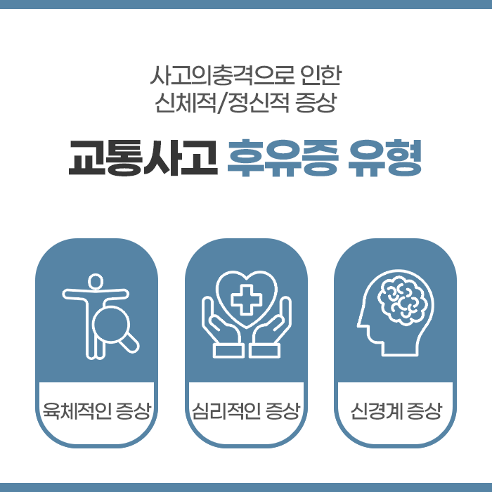 신체적인 증상 뿐만 아니라 우울감, 초조함, 불안감, 외상 후 스트레스 장애 등의 증세들도 유발될 수 있습니다. 게다가 더부룩함, 메스꺼움, 구토, 불면증, 가슴 두근거림, 피로감, 부종 등 다양한 증상들도 교통사고 후유증의 대표적인 증세로 여겨집니다. 증상은 곧바로 나타나는 경우도 있으나 며칠 혹은 몇주 후에 서서히 발생하게 되기에 신경을 쓰고 관리해야 합니다.