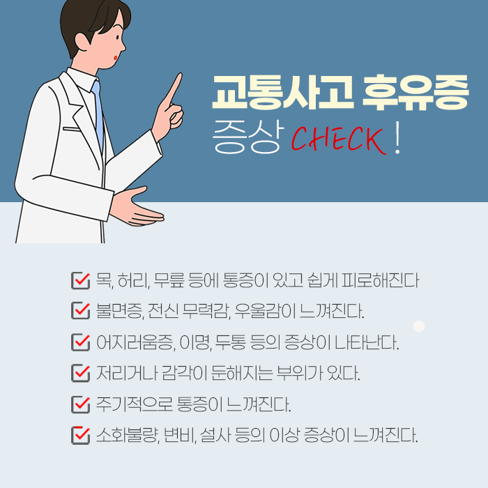 지금 당장 별다른 증세가 없어도 최소 일주일 정도 컨디션 또는 건강 상태를 꼼꼼하게 살펴야 합니다. 통증과 불편함이 발생하기 전에 신속하게 진료를 받는 것이 바람직합니다. 교통사고 후유증은 사고로부터 2~7일 정도 후에 발병하는 경우가 일반적이지만, 최대로는 수개월의 잠복기를 거칠 수 있기 때문에 지속적으로 주의하도록 해야합니다.