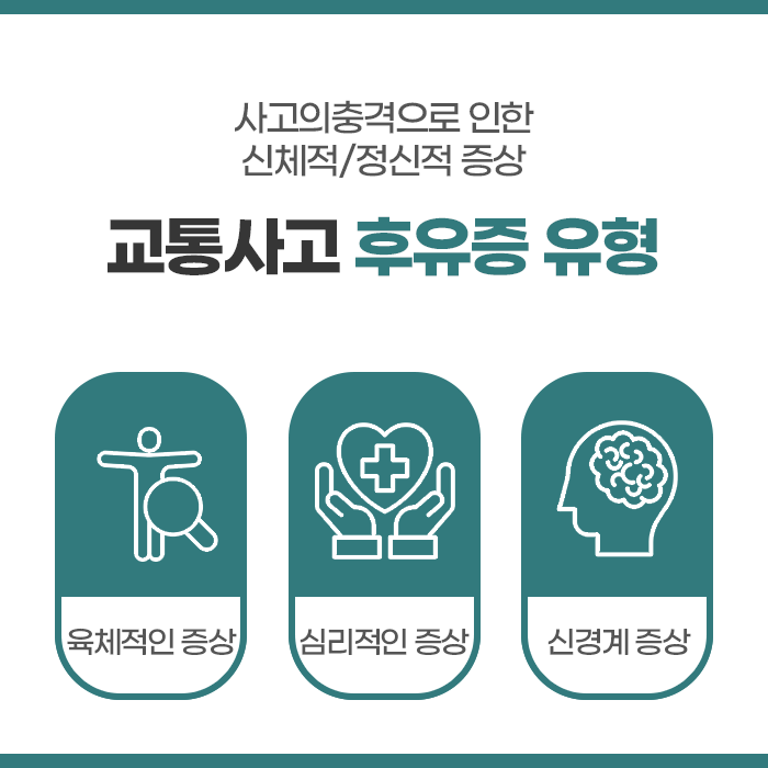 또한 신체적인 증상 외에도 외상 후 스트레스, 우울감, 불안감, 초조함 등의 증상들도 나타납니다. 그 뿐만 아니라 더부룩함, 메스꺼움, 구토, 가슴 두근거림, 불면증, 피로감, 부종 등 여러 가지 증상들도 사고로부터 유발되는 대표적인 증상입니다. 증상은 곧바로 유발되기도 하지만, 며칠 내지 몇주 후에 발생하므로 신경쓰고 관리하도록 해야합니다.