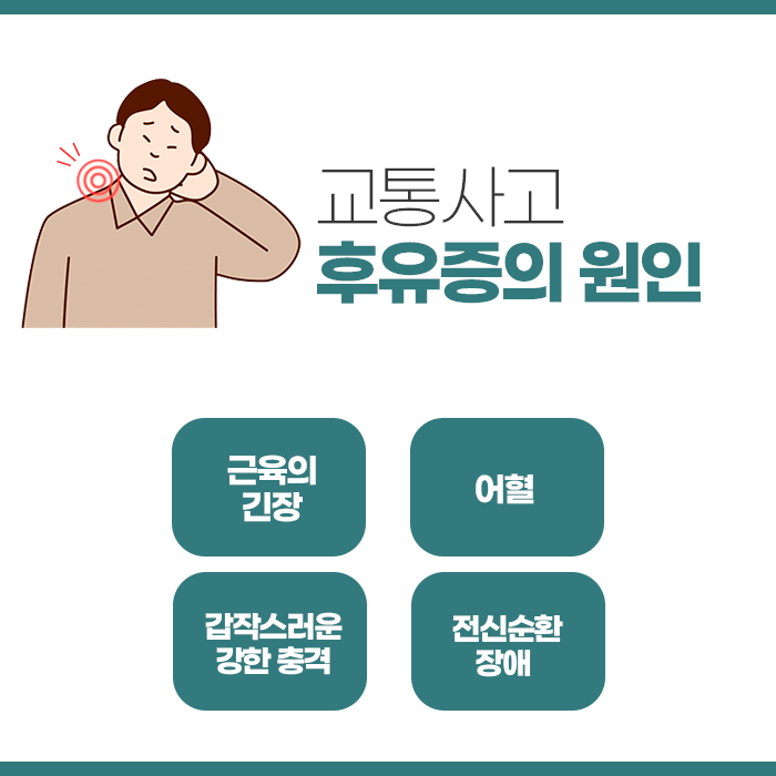 한의학에서는 여러 가지 후유증 증상의 원인을 어혈이라 진단합니다. 어혈을 사고 당시의 강한 충돌로 미세 혈관이 파열되고 배출되지 못하고 체내에 쌓이고 정체되는 죽은 피를 의미합니다. 따라서 혈액 순환이 방해되기 때문에 염증 반응이 생기면서 통증이나 여러 가지 불편함들이 유발됩니다. 따라서 어혈을 진단하여 배출하고 제거해야 하는 과정이 필요합니다. 후유증은 개인마다 증상이 다르며 경과와 회복 속도가 다르기에 획일화된 치료가 아닌, 맞춤형 치료가 진행되어야 합니다.