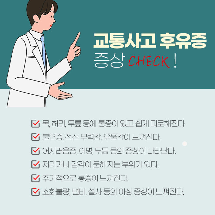 하지만 생활을 하면서 몸을 사용하다보면 점점 통증이나 여러 가지 증상들이 발생하게 됩니다. 별다른 증상이 느껴지지 않더라도 최소 일주일 정도는 컨디션과 건강 상태를 심층적으로 살펴보아야 합니다. 통증, 불편함이 유발되기 전에 신속하게 진료를 받는 것이 좋습니다. 일반적으로 사고 후유증은 2~7일 정도가 지나면서 점점 발생하게 되지만, 최대의 경우 수개월의 잠복기가 이어질 수 있기에 지속적으로 주의가 필요합니다.