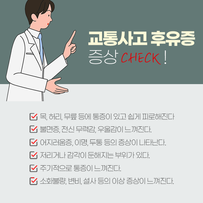 이러한 신체적인 증상뿐만 아니라 불안감, 초조함, 외상 후 스트레스, 우울감 등 심리적인 증세가 나타나기도 합니다. 또한 더부룩함, 구토, 메스거움, 부종, 불면증, 피로감 등 다양한 증세들도 교통사고 후유증의 대표적인 증상에 속합니다. 증상은 곧바로 발현되기도 하지만 며칠내지 몇주가 지나면서 발생할 수 있기 때문에 신경쓰고 관리하도록 해야합니다.