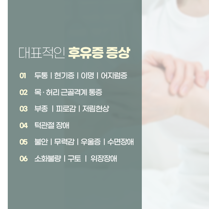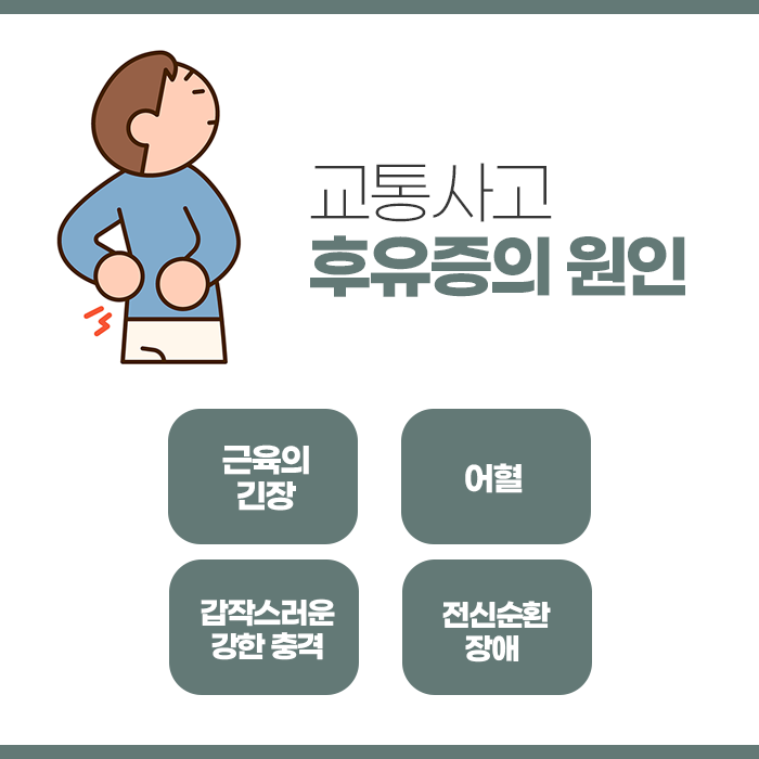 따라서 병변이 개선된 뒤에도 원인을 알지 못하는 증상이 지속된다면 교통사고 후 어혈을 배출하고 제거하는 치료 과정이 이루어져야 합니다. 후유증은 환자마다 증상이 다르기에 경과, 회복 속도가 다르기 때문에 획일화 된 치료가 아니라 맞춤형 치료가 필요합니다.