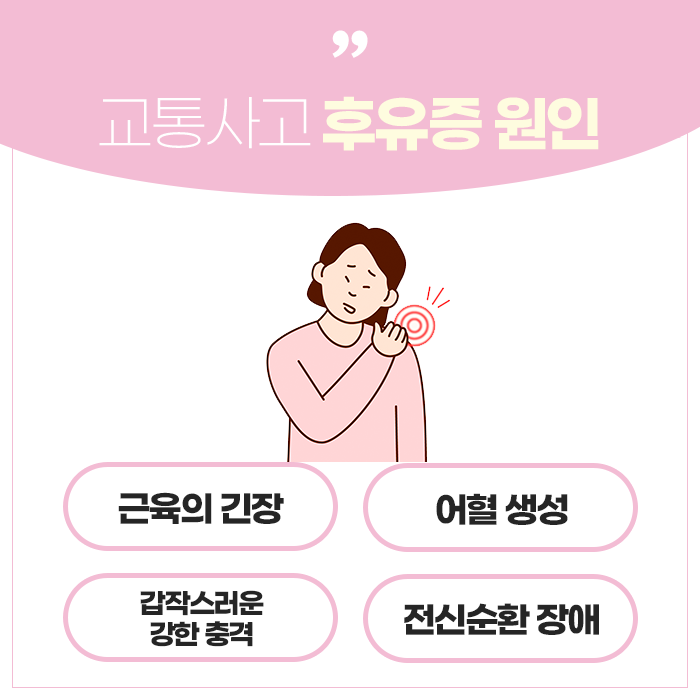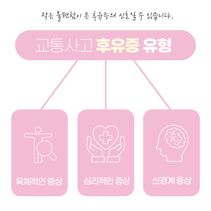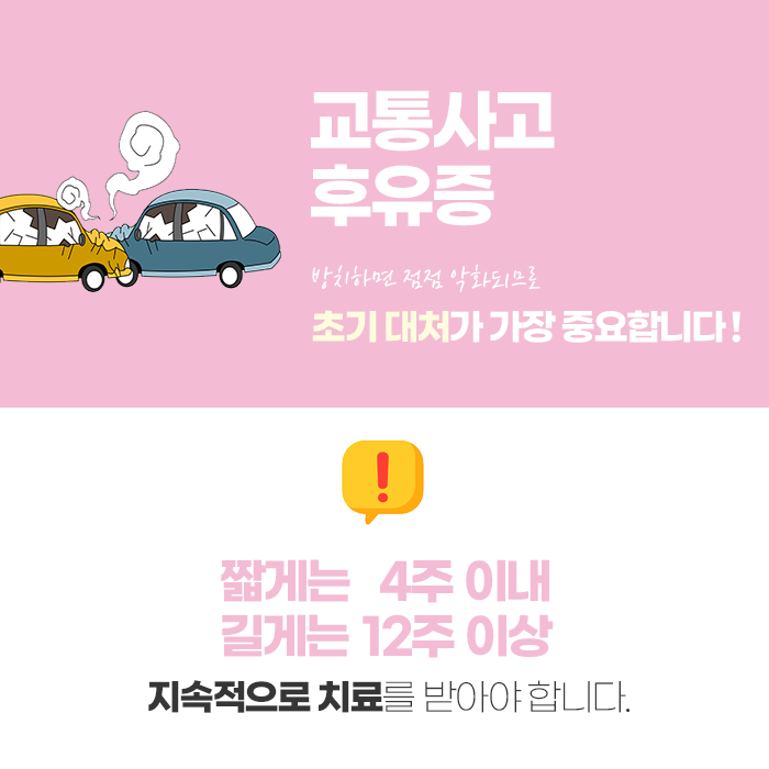 사고로 인한 통증은 단순히 ‘시간이 지나면 나아진다’는 생각보다는, 초기부터 적극적인 대응이 중요합니다. 후유증을 단순한 불편함으로 여기면 삶의 질이 떨어지고 일상 활동에도 제약을 받을 수 있기 때문입니다. 빠른 진단과 꾸준한 관리, 적절한 치료와 회복을 통해 교통사고의 여파를 최소화하는 것이 가장 바람직한 방법입니다.