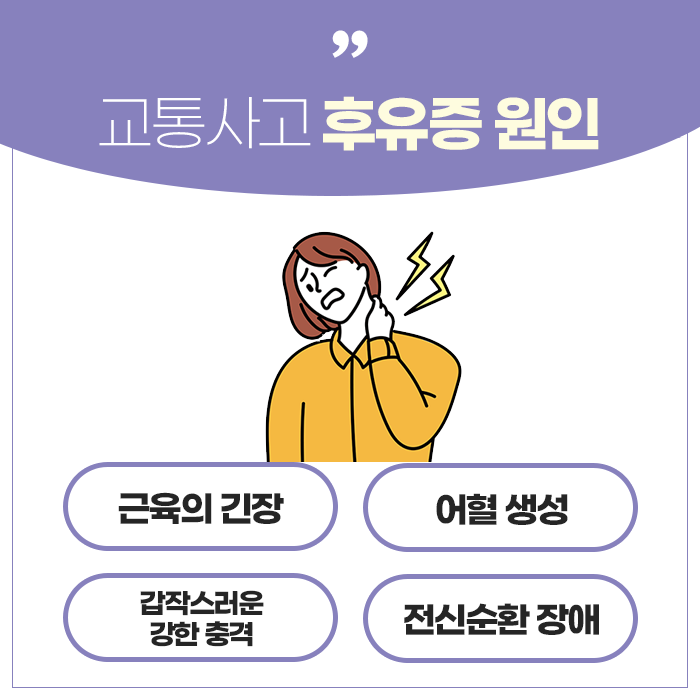 사고 당일이나 이틀 정도는 통증을 인식하지 못하는 경우가 많습니다. 그러나 시간이 흐르면서 호르몬 수치가 안정되고 긴장이 풀리면, 근육통, 뻣뻣함, 저림 등의 증상이 하나둘씩 나타나기 시작합니다. 이러한 후유증은 개인의 체력이나 연령, 기존 건강 상태에 따라 다양하게 나타나며, 장기적으로 방치할 경우 만성 질환으로 이어질 가능성도 존재합니다.