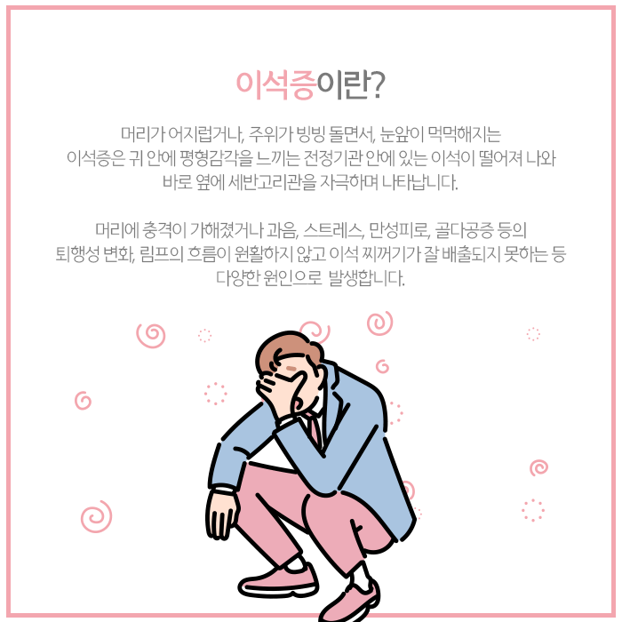 이석증 주요 증상은 자세를 바꿀 때 마치 주변이 빙글빙글 도는 것 같은 느낌이 들거나, 몸이 아래로 가라앉는 것 같은 불쾌한 감각이 생기는 것입니다. 그리고 구역질이나 구토까지 동반되는 경우도 있습니다. 특히 한쪽 방향으로 누웠을 때 증상이 심해지는 특징이 있습니다.