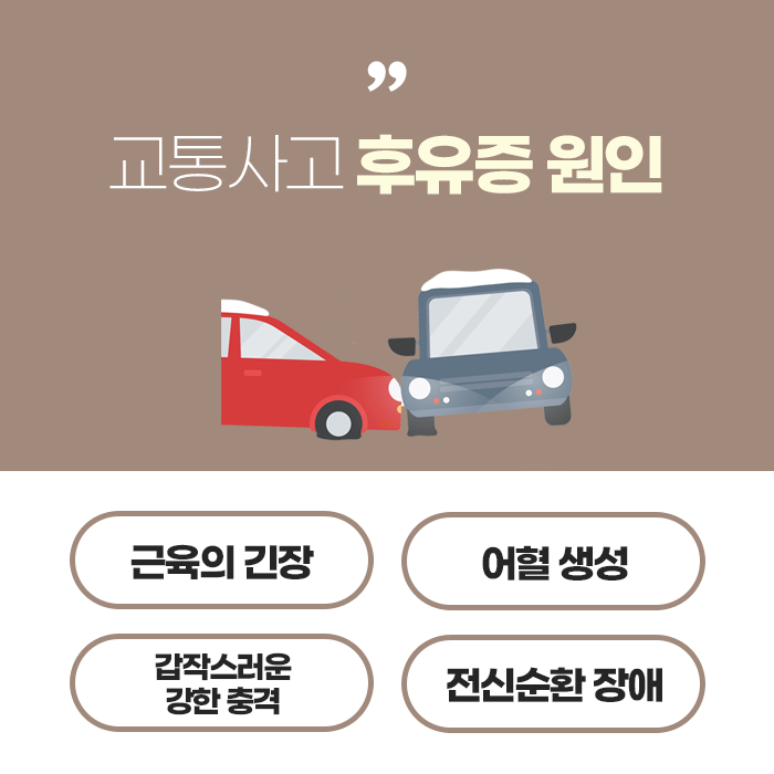 사고의 충격은 외형상 경미해 보여도 내부적으로는 근육, 인대, 관절 등에 손상을 유발할 수 있습니다. 대표적인 증상으로는 편타성 손상(채찍질 손상)이 있으며, 이는 사고 시 목이 갑작스럽게 앞뒤로 흔들리면서 발생하는 손상으로, 목 통증, 어깨 결림, 허리 통증, 팔·다리 저림, 두통, 무기력증 등이 생길 수 있습니다.