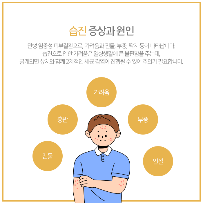 습진은 특정한 질병을 의미하기 보다는 여러가지 증상들을 포함해 피부에 염증이 생긴 것을 말합니다. 대표적인 습진 질환에는 아토피피부염, 화폐상습진, 유두습진, 접촉성 피부염 등이 있습니다.