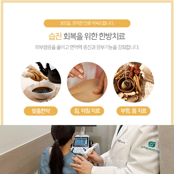 쑥을 활용한 뜸 치료는 따뜻한 기운으로 혈류순환을 촉진하고 면역력 증진과 장부기능 강화를 돕습니다. 외에도 다양한 한방치료는 환자분 체질과 건강상태, 습진 증상에 따라 다르게 적용되므로 검진 후 침산동 습진치료한의원 담당 의료진과 상담을 통해 확인할 수 있습니다.