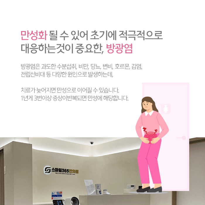 그리고 체내 세균을 몸 밖으로 잘 배출하기 위해 물을 충분히 마시는 게 좋습니다. 피곤하거나, 스트레스를 많이 받거나, 환절기처럼 온도 변화가 커 방광염이 발생하기 쉬운 시기에는 적당한 휴식과 안정을 통해 컨디션 조절과 면역력 증진에 신경써야 합니다.