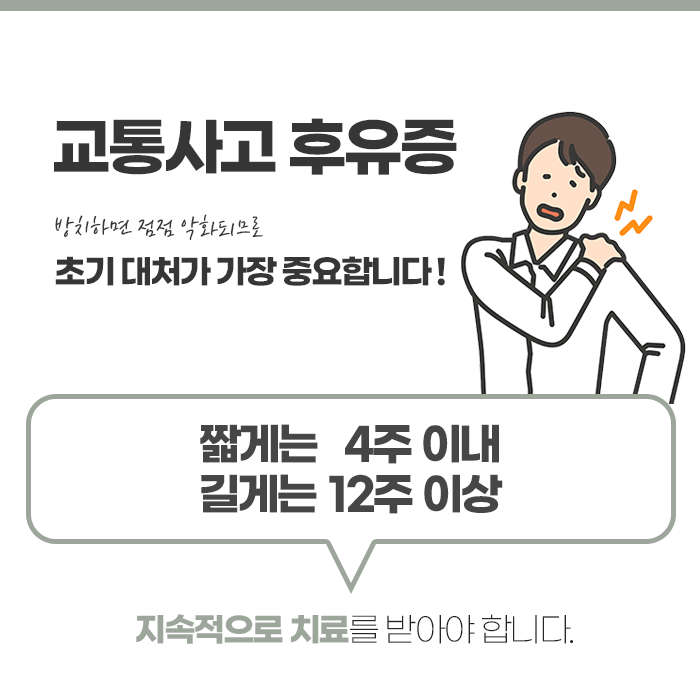 교통사고는 단순히 사고 순간의 충격으로만 끝나는 것이 아닙니다. 사고 이후의 적절한 치료와 관리가 향후 건강과 삶의 질에 중대한 영향을 미치기 때문에 특히 주의가 필요합니다. 특히 사고 직후 4주간의 치료와 회복 과정은 후유증을 예방하고 만성 통증으로의 발전을 막는 데 있어 무척 중요합니다.