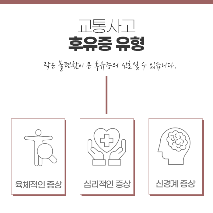 이러한 후유증은 단순한 통증을 넘어서 삶의 질까지 떨어뜨릴 수 있습니다. 신경계 손상으로 인한 저림, 무력감, 집중력 저하, 소화불량, 만성 피로감 등이 나타날 수 있으며, 심한 경우에는 외상 후 스트레스 장애(PTSD)로 발전해 일상생활에 큰 어려움을 주기도 합니다. 불면증이나 가슴 두근거림 같은 증상이 함께 나타나기도 하므로, 교통사고 초기부터 꼼꼼한 검사와 치료를 받아야 합니다.