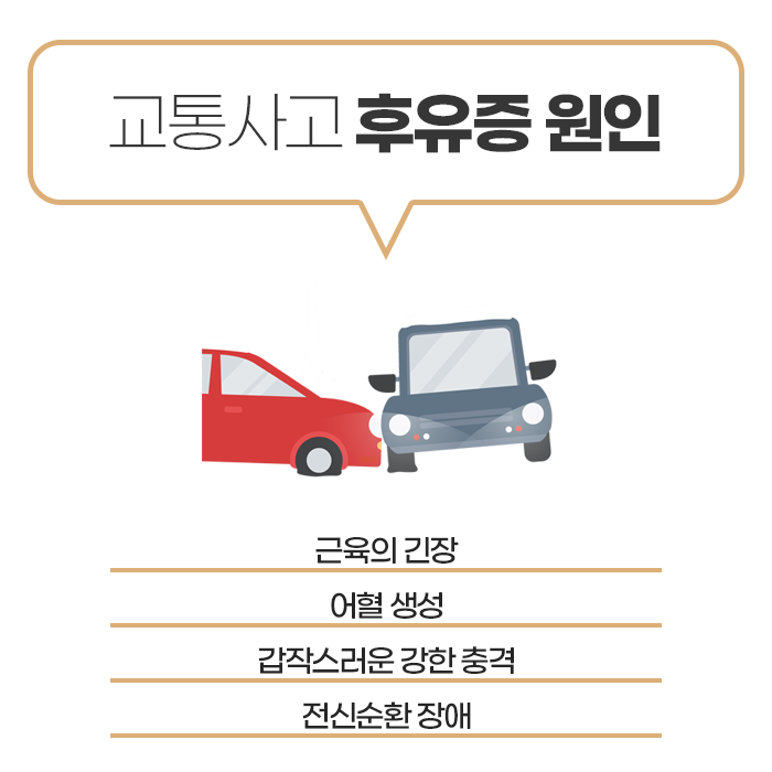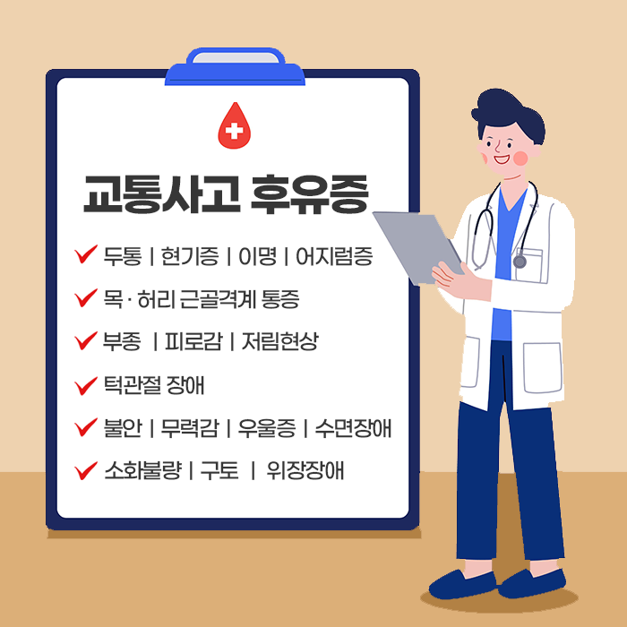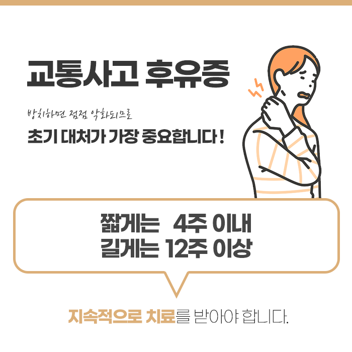 또한 사고 직후에는 몸이 긴장 상태여서 아드레날린 등의 호르몬 분비로 통증이 억제되기도 하는데, 시간이 지나 몸의 긴장이 풀리면서 다양한 증상이 본격적으로 드러날 수 있습니다. 이 시기를 놓치면 증상이 악화되거나 만성화될 수 있으며 심해지면 또 다른 합병증까지 유발될 수 있기 때문에 반드시 초기에 정확한 진단과 치료를 받는 것이 중요합니다.