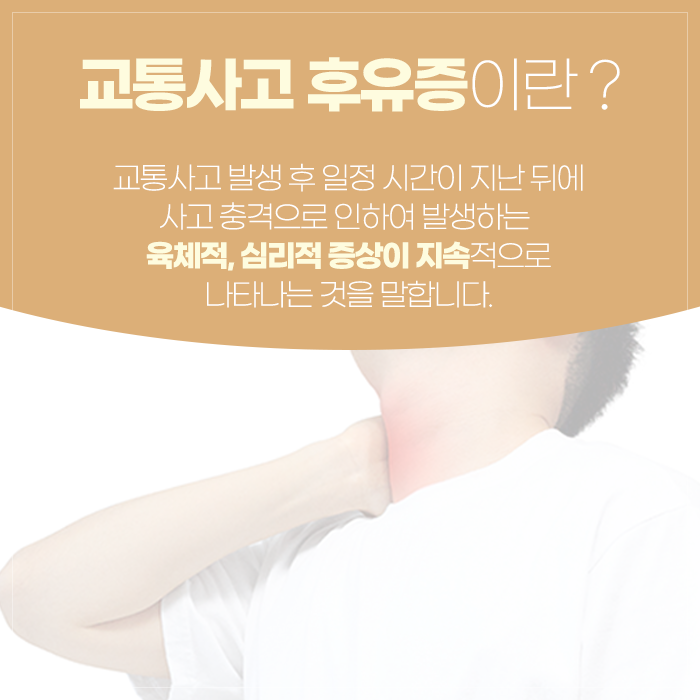 사고 후유증은 대체로 사고 직후보다는 2~7일 정도가 지나서 본격적으로 나타나는 경우가 많습니다. 특히 사고 충격의 강도, 개인의 체질, 평소 건강 상태 등에 따라 증상의 정도와 시기는 모두 다릅니다. 심지어 몇 달이 지나서야 증상이 나타나는 경우도 있으니 주의가 필요합니다. 대표적인 증상으로는 목의 염좌, 즉 편타성 손상이 가장 흔합니다. 차량 충돌 시 머리가 갑자기 앞뒤로 흔들리면서 목 주변 근육과 인대, 디스크 등이 손상되어 통증이 발생하고, 심하면 팔이나 손이 저리거나 어깨나 등까지 통증이 이어질 수 있습니다.