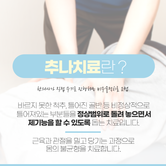 생활 속 통증이나 불편함을 단순히 참고 넘기기보다는, 추나요법을 통해 신체의 균형을 되찾고 건강한 일상으로 나아갈 수 있습니다. 반복적인 통증으로 삶의 질이 떨어졌다면, 이제는 몸의 틀어짐을 바로잡고 자연스러운 회복을 기대할 수 있는 방법에 주목해보는 것도 좋은 선택이 될 수 있습니다.