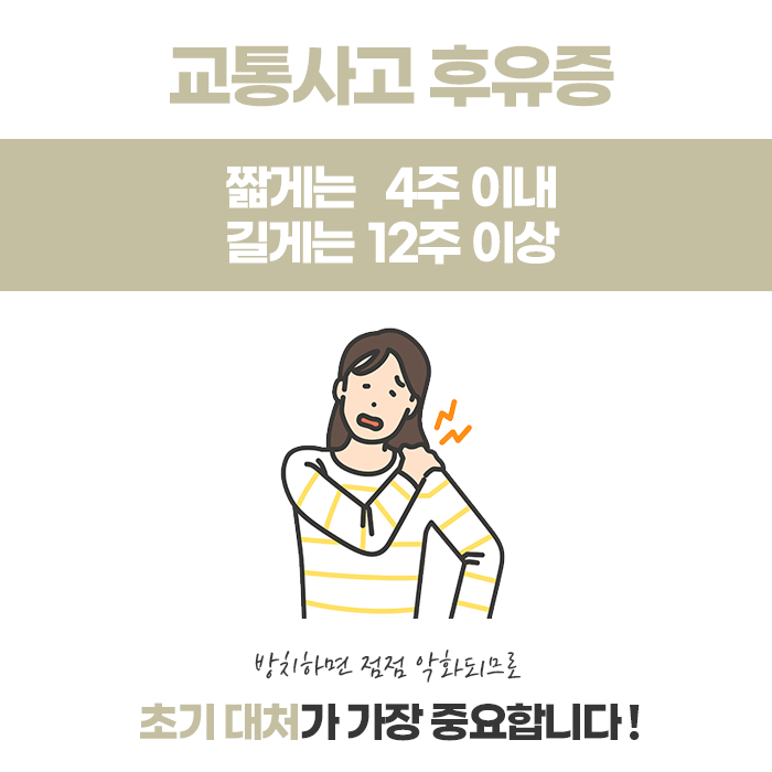 교통사고는 순간적인 충격으로 끝나는 것이 아니라, 사고 이후의 회복 과정이 더욱 중요해지는 경우가 많습니다. 특히 사고 직후 며칠간은 뚜렷한 증상이 나타나지 않아 괜찮다고 느낄 수 있지만, 일정 시간이 지나면서 몸 곳곳에 통증이나 불편함이 생길 수 있습니다. 특히 목, 허리, 어깨 같은 근육과 관절 부위에 통증이 집중되는 경우가 많아 일상생활에 지장을 줄 수 있습니다. 이런 증상들은 무시하고 방치할 경우 만성화될 수 있어, 사고 후에는 반드시 일정 기간 동안 자신의 몸 상태를 주의 깊게 살피고 필요시 빠르게 치료를 받는 것이 중요합니다.