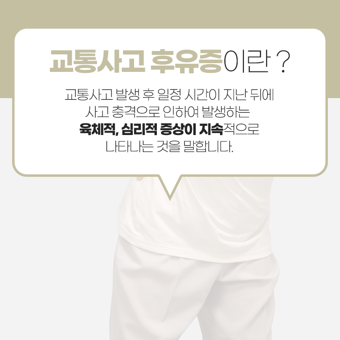 또한 육체적 증상뿐만 아니라 정신적 충격 역시 교통사고 후유증의 중요한 부분입니다. 외상 후 스트레스, 불안, 가슴 답답함, 불면증 등의 증상이 함께 나타날 수 있으며, 이는 단순한 통증보다 더 오랜 시간 동안 삶에 영향을 미치게 됩니다. 따라서 교통사고 치료는 신체 회복뿐 아니라 정신적 안정까지 고려한 전반적인 접근이 필요합니다.