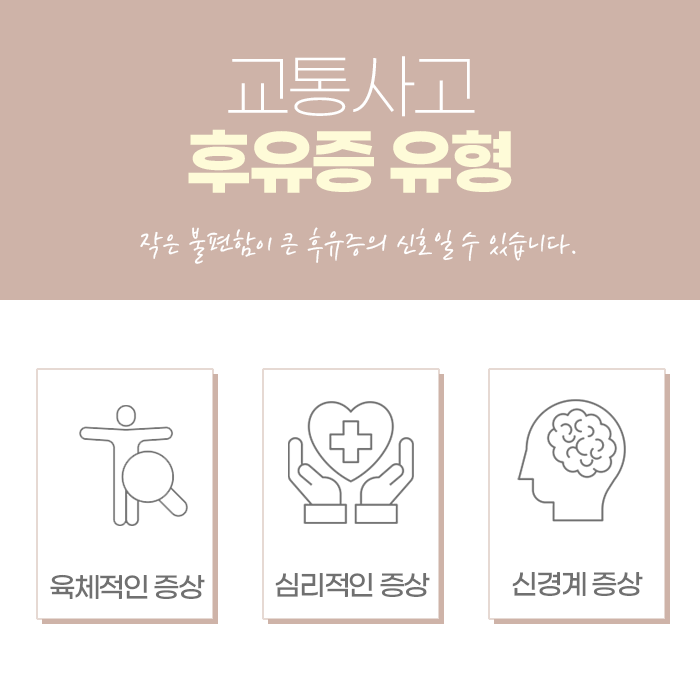 교통사고는 단순히 사고 당시의 충격만으로 끝나지 않고, 이후 나타나는 다양한 증상과 후유증으로 인해 오랜 시간 동안 건강에 영향을 미칠 수 있습니다. 특히 사고 직후 며칠에서 몇 주 사이에는 특별한 증상이 없더라도, 시간이 지나면서 목이나 어깨, 허리 등의 통증이 서서히 나타나는 경우가 많습니다. 이처럼 후유증은 점진적으로 진행되기 때문에, 사고 후 일정 기간은 자신의 몸 상태를 꼼꼼하게 살펴보고 필요할 경우 치료를 받는 것이 무엇보다 중요합니다.