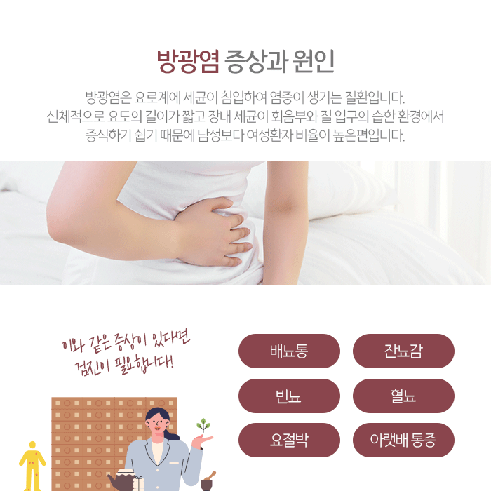 소변을 자주 보고, 찌릿찌릿한 작열감을 느끼며, 소변을 보고 난 후에도 시원치 않은 느낌, 허리 아래의 통증, 치골 상부의 통증이 주요 증상입니다. 심하면 소변에 피가 섞여 나오는 혈뇨가 발생하기도 합니다.