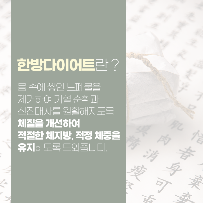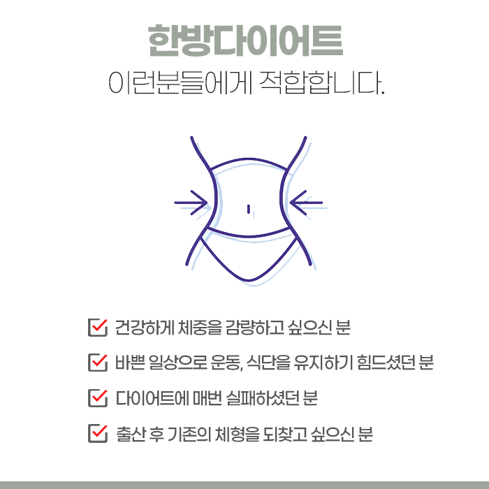 수차례 다이어트에 실패했거나 반복된 요요로 어려움을 겪고 있다면, 이제는 체계적이고 안전한 방법을 선택할 필요가 있습니다. 내 몸의 특성과 현재 상태에 맞춘 한방 다이어트는 단기적인 체중 감량뿐만 아니라 장기적인 건강 회복에 이르기까지 다양한 효과를 기대할 수 있습니다.
