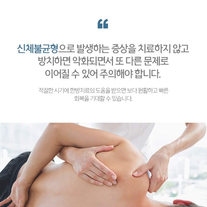 신체불균형으로 인한 문제는 반복되는 통증과 함께 이후 건강상태에 많은 영향을 미칠 수 있어 초기에 적극적으로 대응하는 것이 중요합니다. 그리고 재발할 수 있기 때문에 한방치료와 함께 개인적인 꾸준한 관리가 필요합니다.