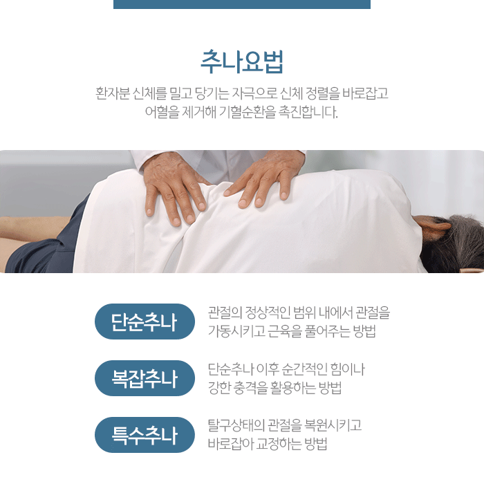 단순추나는 문제가 있는 관절 근육 조직을 정상 운동 범위 내에서 움직이거나 이완시켜 회복하는 방법이고 복잡추나는 관절, 근육조직을 이완시킨 후 교정기법으로 바로잡는 방법입니다.