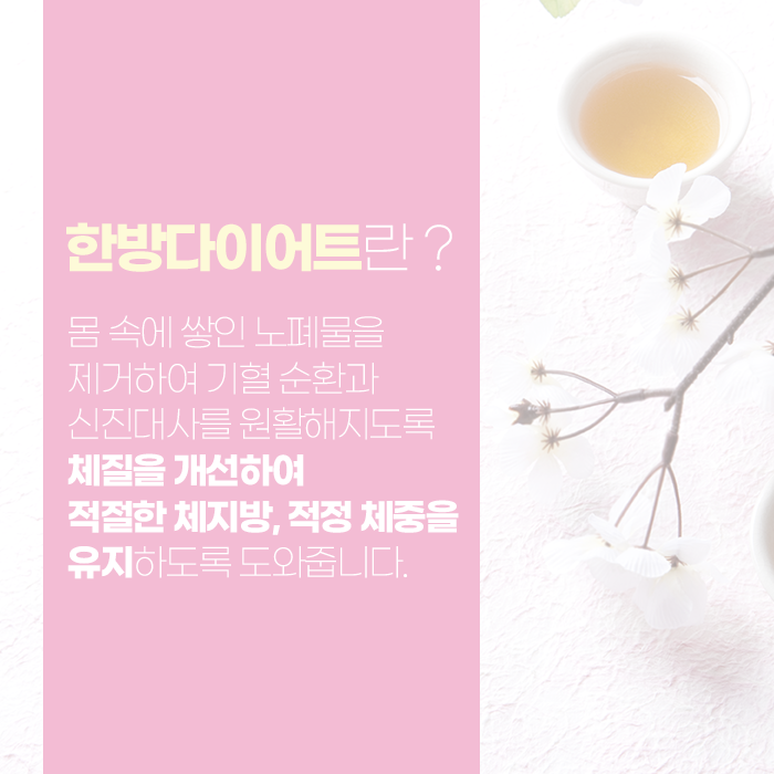 한방에서는 한약 처방을 통해 체내 지방 분해를 촉진하고 식욕을 자연스럽게 억제하는 데 도움을 줍니다. 또한 체내 노폐물과 과잉 수분을 배출하여 혈액 순환을 개선하고, 장 기능을 활성화해 변비와 소화불량 같은 불편함을 완화합니다.