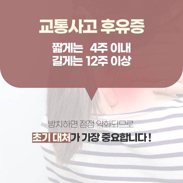 교통사고는 짧은 순간 일어나는 일이지만, 그 여파는 단순히 일회성 충격에 그치지 않고 오랜 시간 몸과 마음에 큰 변화를 가져올 수 있습니다. 겉으로 드러나는 상처가 없다고 해서 괜찮다고 안심하기보다는, 사고 직후부터 미묘하게 변하는 자신의 상태를 꼼꼼히 점검하는 자세가 필요합니다. 많은 경우 목, 어깨, 허리 등 부드러운 조직에 미세한 손상이 축적되어 며칠에서 수주 안에 결림, 뻐근함, 통증 같은 증상으로 나타나며, 이 시기를 어떻게 대처하느냐에 따라 치료 효과와 회복 속도가 달라질 수 있습니다. 보통 교통사고 후유증은 사고 직후가 아닌 2~7일 사이 가장 두드러지며, 경우에 따라 수개월이나 수년이 지난 뒤 지연성 증상으로 나타나기도 합니다.