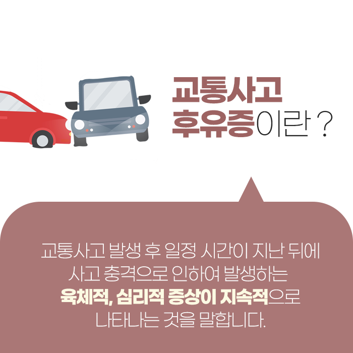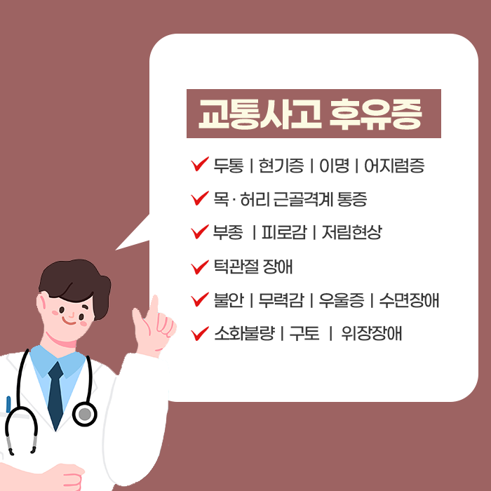 사고 당시 느낀 공포와 놀람은 신경계에 여운을 남겨 불안, 초조함, 불면증, 우울감을 유발하고, 소화불량, 두근거림, 만성피로 같은 자율신경계 증상까지 일으킬 수 있습니다. 심리적 문제 역시 만성화되면 일상생활에 큰 지장을 초래할 수 있어 조기 발견과 적절한 치료가 중요합니다.
