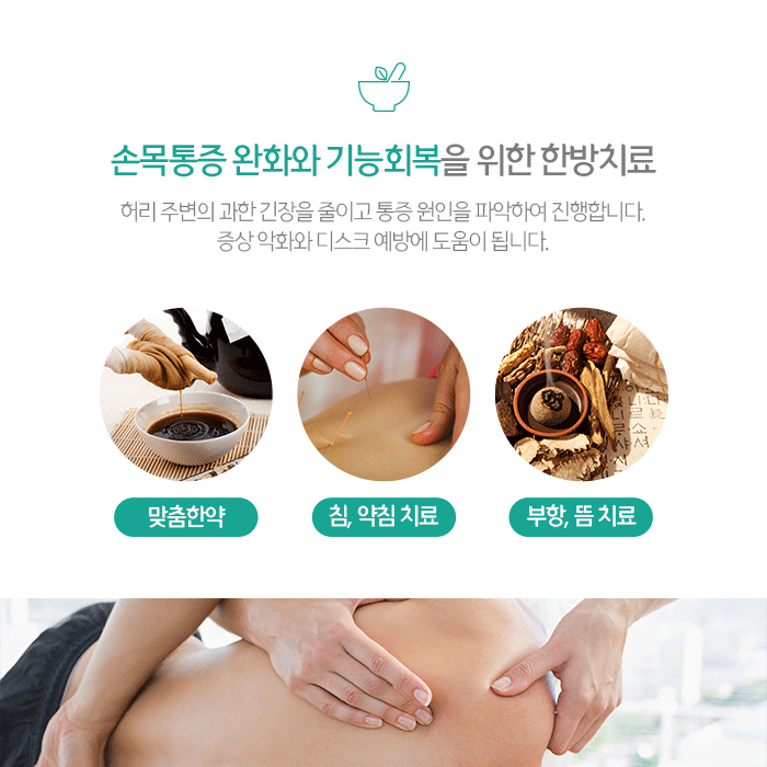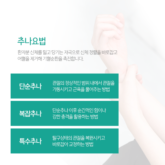 손목통증을 줄이고 기능회복을 위해 추나요법, 한약, 약침, 부항, 뜸 등의 복합적인 한방치료를 진행합니다. 어깨와 팔, 손목 등으로 이어지는 정렬이 틀어지면 손목에 부담이 가중되면서 문제가 생기기도 합니다. 이 경우 진행하는 추나요법은 의료진이 손과 신체, 소도구 등을 활용해 환자분 틀어진 신체를 밀고당기는 자극으로 신체정렬을 바르게 하고 어혈을 제거해 기혈순환을 촉진하는 한방치료입니다.