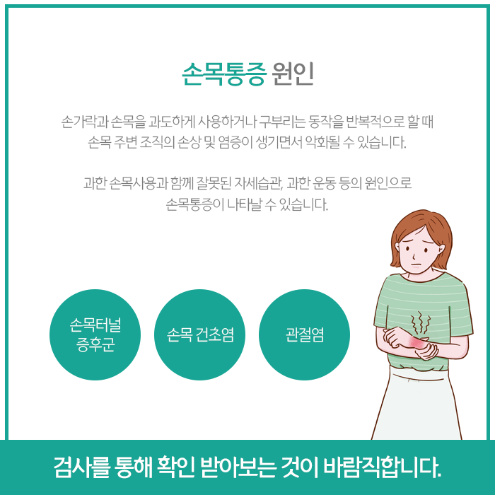 손목은 사용이 많은 부분으로 문제가 발생하면 쉽게 나아지지 않고 재발하는 경우가 많습니다. 그래서 통증이나 불편함 등의 문제가 있다면 초기에 적극적으로 대응하는 것이 바람직합니다. 초기에 대응할수록 원활한 회복에 큰 도움이 됩니다.