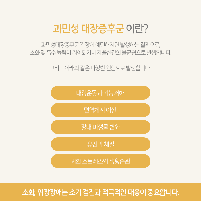 적은 양의 음식이나 장내 가스만으로도 복통이 심해지고, 설사와 변비가 번갈아 나타나기도 합니다. 식사 이후나 긴장을 느낄 때 복부 팽만감이나 잔변감, 심하면 무력감과 가슴 두근거림 같은 전신 증상까지 동반하기도 합니다.