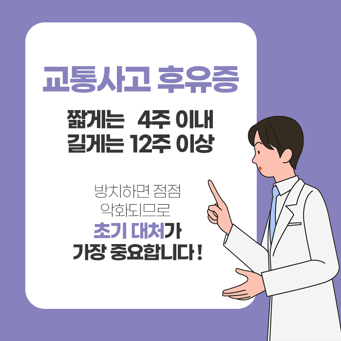 초기 대응이 적절하지 않으면 통증이 만성화되거나 일상생활에 불편함이 지속될 수 있으므로, 사고 이후에는 작게 느껴지는 증상도 소홀히 하지 말고 꾸준한 관찰과 치료가 필요합니다. 회복을 위한 노력은 하루빨리 건강한 일상으로 복귀하기 위한 첫걸음입니다.