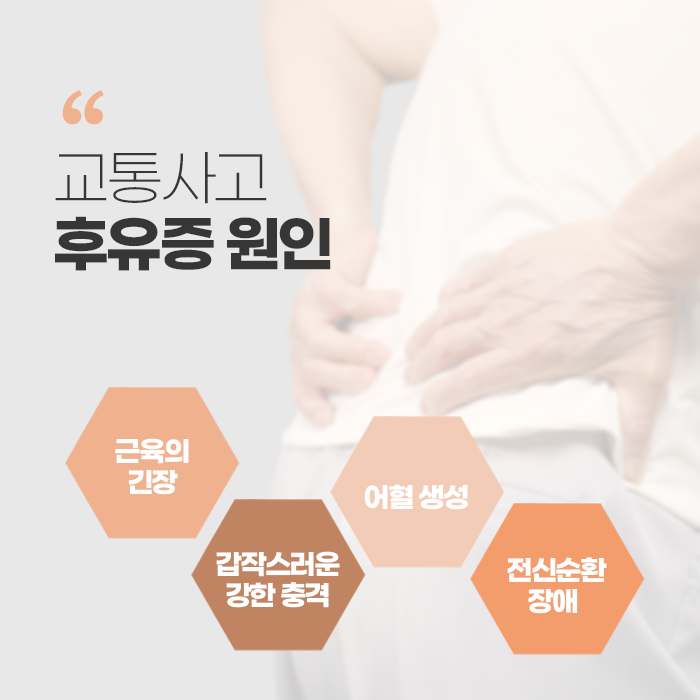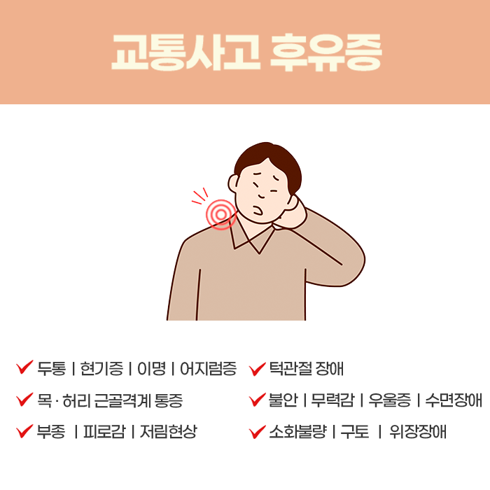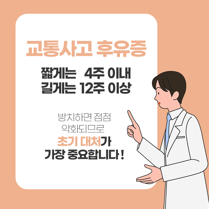 사고 직후에는 큰 증상이 없다고 치료를 소홀히 하기 쉽지만, 시간이 지나면서 불편함이 나타나기 때문에 증상이 없더라도 일정 기간 정기적인 검진과 치료가 권장됩니다. 특히 치료 없이 방치할 경우 만성 통증, 근육 약화, 관절 기능 저하, 신경 손상 등 다양한 후유증이 생길 수 있어 주의가 필요합니다.