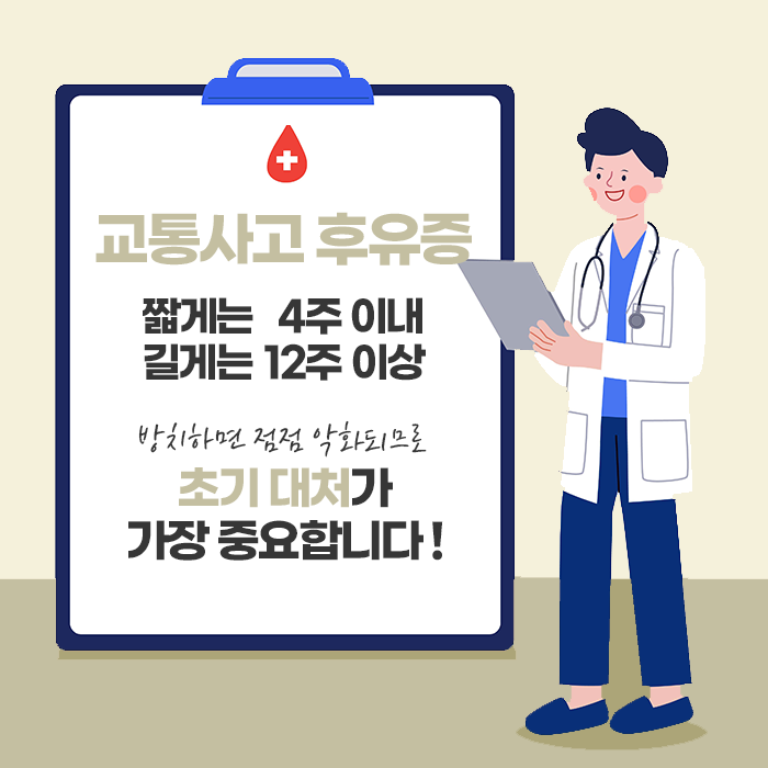 많은 경우, 사고 직후 별다른 증상이 없다고 치료를 소홀히 하다가 며칠, 몇 주 후부터 점차 불편감이 심해지는 사례가 많습니다. 따라서 외상이 없더라도 사고 이후에는 일정 기간 동안 지속적인 경과 관찰과 치료를 받는 것이 권장됩니다. 통증이 장기화되면 근육 위축, 관절 운동 제한, 신경 압박 등으로 이어질 수 있으므로 방치는 금물입니다. 회복 기간 동안에는 과도한 활동을 자제하고, 바른 자세를 유지하며, 규칙적인 생활과 충분한 수면, 영양 섭취로 몸의 회복력을 높이는 것이 중요합니다.
