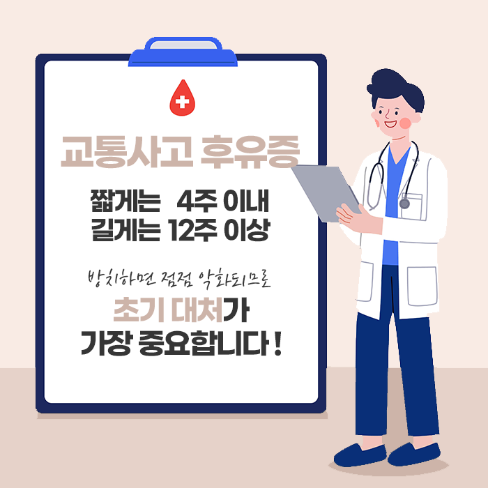 사고 이후 아무런 증상이 없더라도 방심은 금물입니다. 시간이 지나 후유증이 나타날 수 있기 때문에 사고 이후에는 일정 기간 내에 정기적인 검진과 치료가 필요합니다. 특히 치료 시기를 놓치면 회복 기간이 길어지고, 통증이 만성화되며, 신경 손상이나 관절 기능 저하 등으로 이어질 수 있으므로 조기에 조치를 취하는 것이 가장 중요합니다.