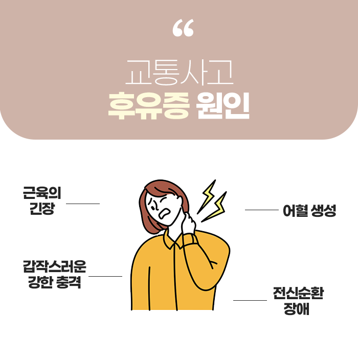 교통사고는 예기치 않게 발생하는 경우가 많아 사전에 완벽히 예방하기 어렵습니다. 사고 직후에는 차량의 손상 정도나 겉으로 드러난 외상의 유무에 집중하는 경향이 있으나, 실질적으로는 내부 장기나 근육, 인대, 신경 등의 미세한 손상이 더 중요한 문제로 작용할 수 있습니다. 사고 당시 분비되는 아드레날린과 코르티솔 같은 스트레스 호르몬은 통증을 일시적으로 둔화시키는 역할을 하므로, 초기에는 이상이 없어 보이더라도 시간이 지나면서 증상이 점차 나타날 수 있습니다.