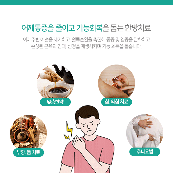 외에도 다양한 한방치료는 체질과 건강상태, 어깨통증 원인과 동반되는 증상과 원인에 따라 다르게 적용되므로 담당 의료진과 상담을 통해 확인할 수 있습니다.