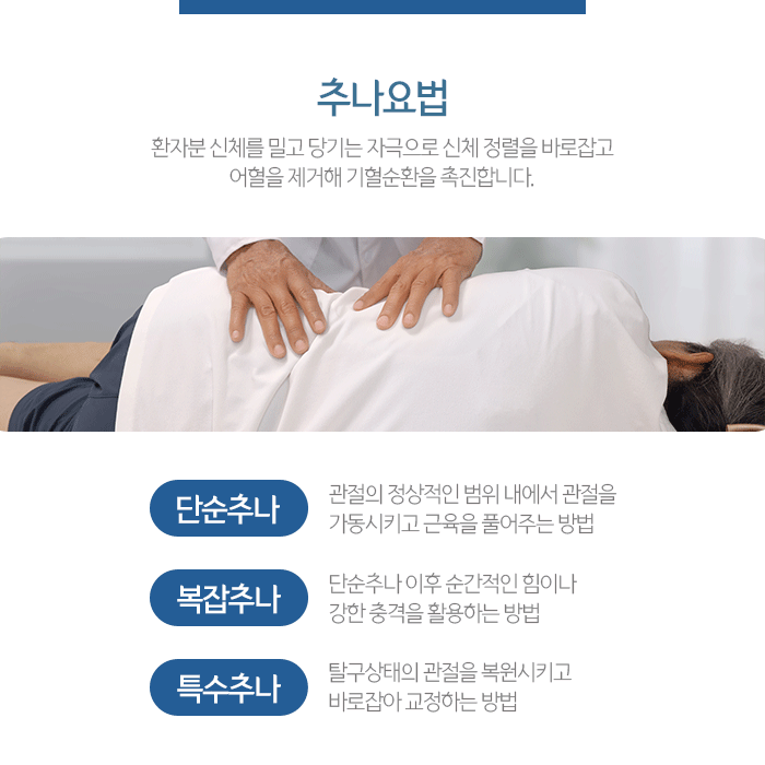 담당 의료진이 손과 신체, 소도구 등을 활용해 환자분 신체를 밀고당기는 자극으로 정렬을 바르게 하고 어혈을 제거해 기혈순환을 촉진하며 염증과 발바닥 주변 통증을 줄이는 한방치료입니다.