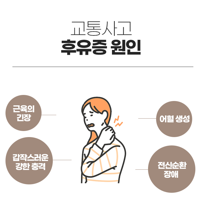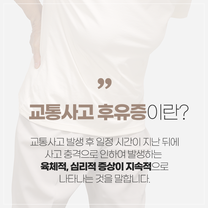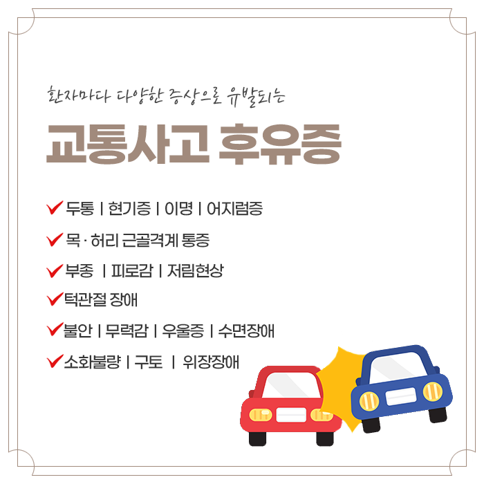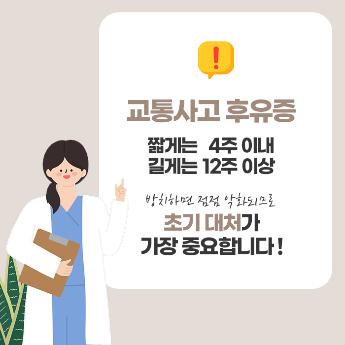 교통사고는 예기치 않게 발생하며 사고 직후에는 외상이 뚜렷하지 않더라도 시간이 흐르면서 신체적, 정신적인 불편함을 유발할 수 있습니다. 사고 직후 스트레스 호르몬이 분비되면서 통증이 일시적으로 억제될 수 있기 때문에 초기에는 별다른 증상이 나타나지 않는 경우가 많습니다. 하지만 몇 일이 지나면 목, 어깨, 허리, 무릎 등 다양한 부위에서 통증이나 저림, 뻐근함이 점차 발생할 수 있기 때문에 사고 후 가능한 한 빨리 병원을 찾아 상태를 점검하고 치료 계획을 세우는 것이 중요합니다. 후유증은 최소 2~3일 후, 심할 경우 수개월이 지나서 발생하기도 합니다.