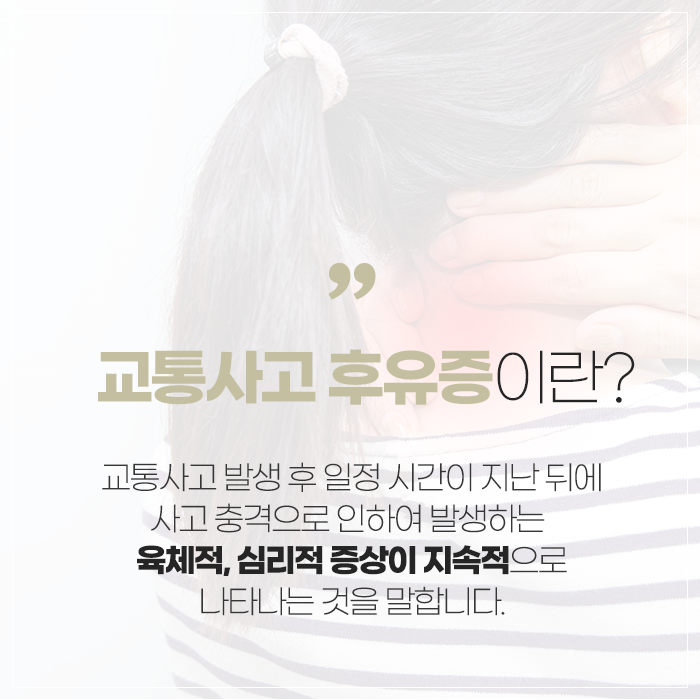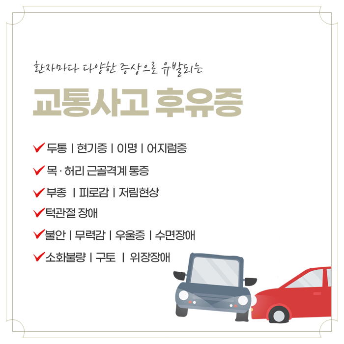 교통사고는 언제든 예기치 않게 발생할 수 있으며, 사고 직후에는 겉으로 드러나는 상처가 없어도 시간이 지나면서 신체적, 정신적인 불편함을 초래할 수 있습니다. 사고 직후에는 스트레스 호르몬이 분비되어 일시적으로 통증을 억제하는 경우가 많기 때문에 초기에는 별다른 증상이 나타나지 않을 수 있습니다. 그러나 며칠 또는 몇 주가 지난 후에는 목, 어깨, 허리, 무릎 등 다양한 부위에서 통증이나 뻐근함, 저림, 불편함이 점차적으로 나타나므로 사고 후에는 빠른 시일 내에 병원을 방문하여 상태를 점검하고 적절한 치료를 받는 것이 매우 중요합니다.
