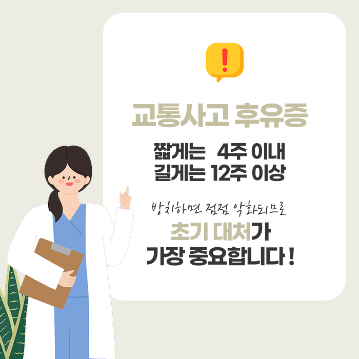교통사고 후 증상이 가벼워 보이더라도 조기에 치료를 받는 것이 중요하며, 치료를 마친 후에도 최소 1~2주 정도는 상태를 지속적으로 점검하고 관리해야 합니다. 시간이 지나면서 증상이 악화될 수 있기 때문에, 필요시 성내동일요일한의원 등 의료기관의 도움으로 추가 치료나 정기적인 건강 점검을 받는 것이 좋습니다.